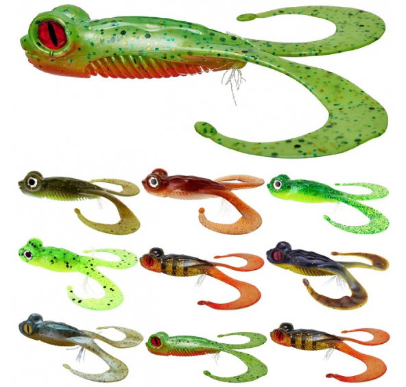 Nástraha se dvěma ocásky, která věrně napodobuje žábu. Velké oči ještě zvyšují její atraktivitu. Průřezy na offsetový háček pro lov v překážkách. S žábou je ideální prochytávat okolí břehů, rostlin nebo potopených stromů. Nastražit ji můžete celou řadou způsobů pomocí klasické jigové hlavičky, zavrtávací hlavičky anebo na offsetový háček. Ideální nástraha pro lov především štik, ale neztratí se ani při lovu sumců. Délka 10 cm, váha 16,1 g.