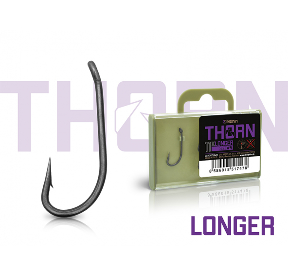 Díky moderním technologiím, které byly použity při výrobě, jsou tyto háčky synonymem nekompromisní pevnosti a maximální ostrosti. Háčky ze série THORN disponují titanX povrchovou úpravou, čímž nabývají matný šedý povrch, který je navíc dokonale hladký pro snadné proniknutí do kapří tlamy. TitanX se stará také o zpevnění a odolnost celého háčku. Pomocí aplikované technologie Ultrapoint 4.8 bylo možné vytvořit delší hrot, který poskytuje přímo neuvěřitelnou ostrost. Háčky Delphin THORN jsou baleny v praktické krabičce, ve které bude jejich ostří vždy důkladně chráněno. Na krabičce se navíc nachází držák s očkem na zavěšení do prodejen, který lze snadno odstranit odlomením bez jakéhokoli nástroje, díky čemuž krabička ve vaší výbavě zabere podstatně méně místa. THORN Longer je typický svým dlouhým a rovným ramínkem se zahnutým očkem, malým obloukem a rovným dlouhým hrotem. Všechny tyto vlastnosti napomáhají extra rychlému otočení a vniknutí háčku do tlamy kapra. Pokud hledáte model, na který budete mít spoustu záběrů a dobře si zachytáte, pak je Longer tou správnou volbou právě pro vás. Tento tvar háčku je univerzální, takže s ním lze lovit na potápivé, neutrálně vyvážené i plovoucí nástrahy.