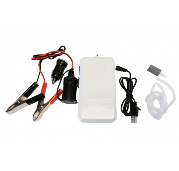Okysličovač vody slouží jako dobrý pomocník při přechovávání nebo transportu rybek s možností napájení přes USB konektor AA baterie nebo konektoru do auto zapalovače.