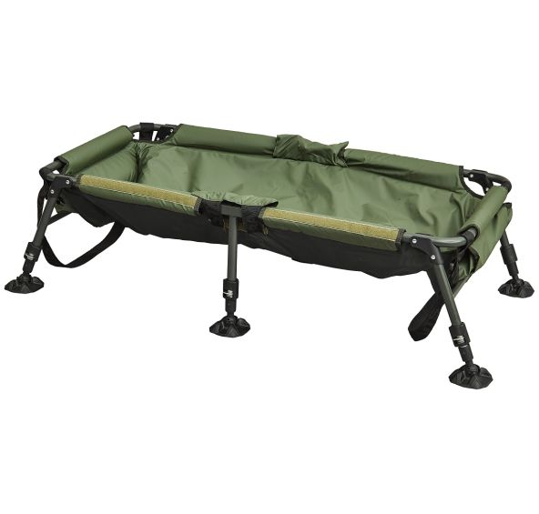 Podložka kolébkového tvaru zajišťuje zcela bezpečnou a šetrnou manipulaci s rybou. Je vyrobena z lehké, avšak velmi pevné hliníkové konstrukce a velmi odolného a dokonale polstrovaného materiálu. Důmyslně řešená víka na obou stranách podložky umožňují rychlé uzavření vaničky a napomáhají zklidnění ryby zakrytím její hlavy. Na obou koncích dna podložky se nachází pevné gumové mřížkované otvory na odtok vody. Díky 6-ti výškově nastavitelným nohám lze podložku ideálně přizpůsobit jakémukoli terénu pro perfektní stabilitu. Pro pohodlnější a skladnější transport lze podložku složit. Výška: 37–49 cm / Délka: 120 cm / Šířka: 73 cm