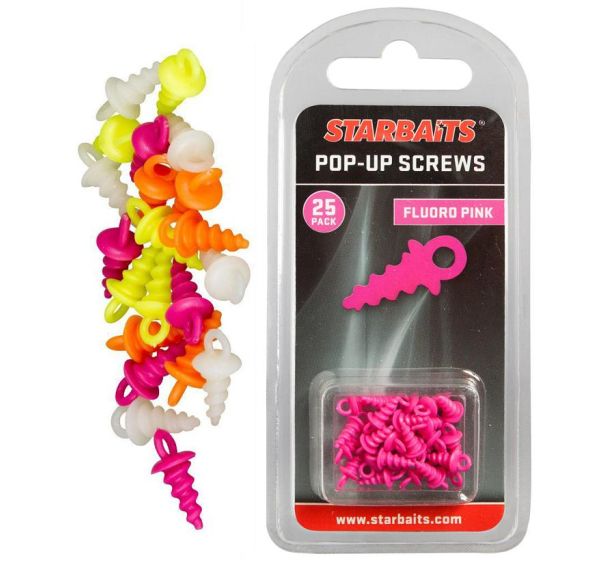 Pop up Screws - tato speciální novinka od firmy StarBaits vám usnadní mnoho práce. Pop up Screws, vám umožní rychle a efektivně nastražit pop up boiles. Šroub je vyroben ze speciálního plastu, který pevně drží v nástraze. Použití je jednoduché, šroub zašroubujete do pop up boilies a kroužek provlečete přes oblouček háčku. Nakonec to zajistíte stoperem. Ideální i pro použití s umělými nástrahami na Zig Rig. Ve čtyřech barevných provedeních, fluo žlutá, fluo růžová, fluo oranžová a bílá. V balení 25 ks.