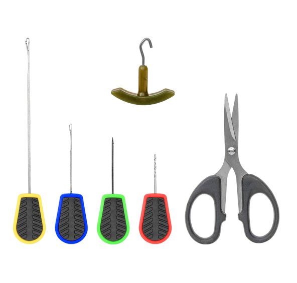 Praktická sada sestávající ze tří různých navlékacích jehel, vrtáku na boilies, testovače a utahováku uzlů a praktických nůžek. Navlékací jehly jsou v provedení s ochranným krytem. Nůžky jsou určeny na stříhání vlasců, ale i splétaných šňůr. Je to praktická pomůcka, která by neměla chybět ve výstroji žádného rybáře. Výrobce Carp Zoom