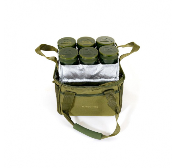 NXG Bait Bag je ideální pro skladování všech vašich oblíbených nástrah na jednom místě. Je dodáván se 6 nepropustnými nádobkami, které jsou umístěny v izolované, odnímatelné vaničce. Vnitřní část je vyrobena z PVC materiálu, který lze snadno čistit. Do síťovaných, bočních kapes, nebo do přední kapsy na zip, se vejde spousta dalších pomůcek, jako jsou PVA materiály, jehly a další drobné předměty. Pouzdro je vyrobeno z Polyesteru 600 Denier v jemném, olivově zeleném provedení. Neoprenové rukojeti, jsou velice pohodlné při přenášení.