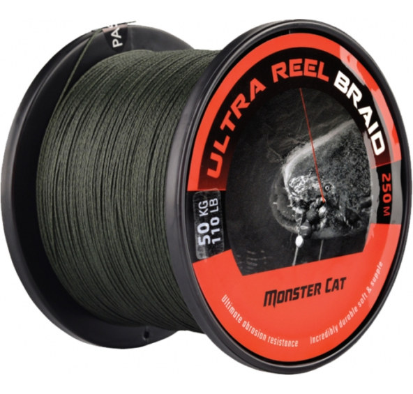 Speciální sumcové šňůra Monster Cat. Šňůra se vyznačuje extrémní odolností proti oděru a roztržení. Osm proplétaných vláken PPTA dodává šňůře maximální pevnost. Výborný poměr ceny a kvality potěší každého rybáře. Výborná pevnost v uzlu a zeleno-černá barva zaručí dokonalé maskování ve vodě. Zvýšená odolnost proti mechanickému poškození a minimální roztažnost Vám umožní zdolávat i největších protivníků.