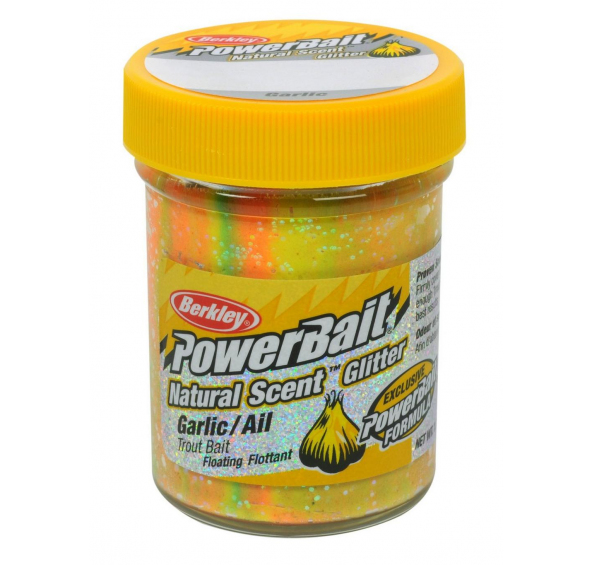 Popis produktu Berkley Těsto PowerBait Natural Glitter Trout Bait Garlic Rainbow 50g