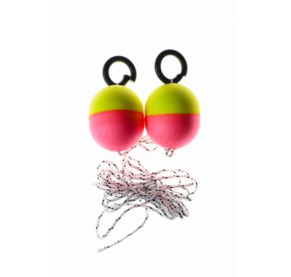 Průměr 25 mm,v balení 2 ks,vyrobeno z polystyrénu, barva reflexní žlutá a červená, délka šňůrkyna přivázání k vidličce je 1 m.