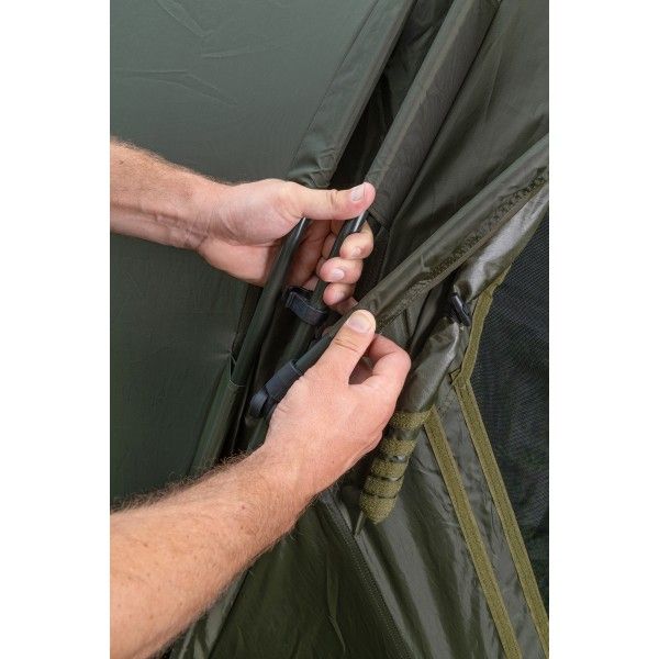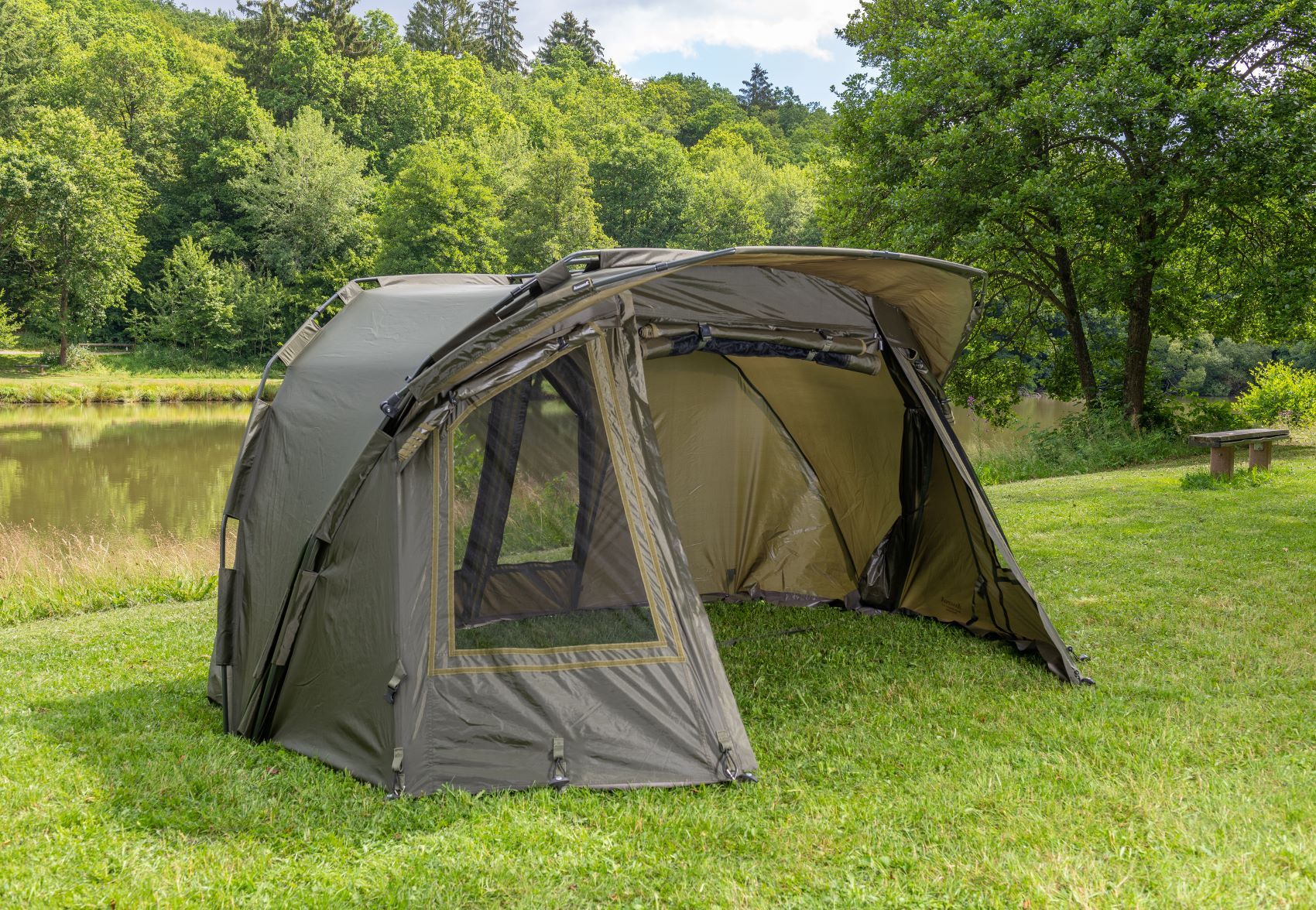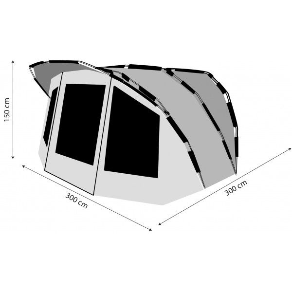 Tento bivak je spíše velkolepý vojenský bunkr. Je multifunkční a velmi prostorný. Může být postaven jako velký bivak minimálně pro 2 lehátka, ale může být během chvilky proměněn v bivak pro jednoho. Stačí pouze stáhnout zadní část a zajistit ji s připevněnými sponami. Velký kšilt zabraňuje vnikání dešťové vody vstupním prostorem. Systém tří vzpěr dává bivaku pevnou stabilní základnu, na kterou se můžeme spolehnout ve větrním počasí. K bivaku lze dokoupit zimní přehoz. Bivak: rozměry pro dvě lehátka 300 x 300 x 150 cm rozměry pro jedno lehátko 240 x 320 x 150 cm materiál: 210D polyester s PVC povlakem transportní rozměr: 180 x 40 cm boční okna: 50 x 95 cm vodní sloupec: 8000 mm obousměrné zipy odolné proti větru s integrovaným gumovým krytem 2 okna vzadu 40 x 100 cm vstupní výška: 110 x 140 cm rozměr kšiltu: 50 cm x 280 cm včetně přepravního pouzdra z 600D polyesteru hmotnost 13,3 kg...