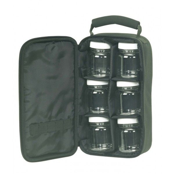 Silně polstrované pouzdro na nástrahy a návnady namočené v dipech apod. Taška obsahuje 6 průhledných nádob o objemu 100 ml. Dózy jsou lehce uzavíratelné, mají víčko s gumovým těsněním. Na víku je gumová páska k uchycení až pěti předmětů potřebných při manipulaci s materiálem v dózách. Například boilie jehly apod. Rozměry pouzdra jsou cca 29x 16x 8 cm. Taška je vyrobena z voděodolného polyesteru 600 x450D.