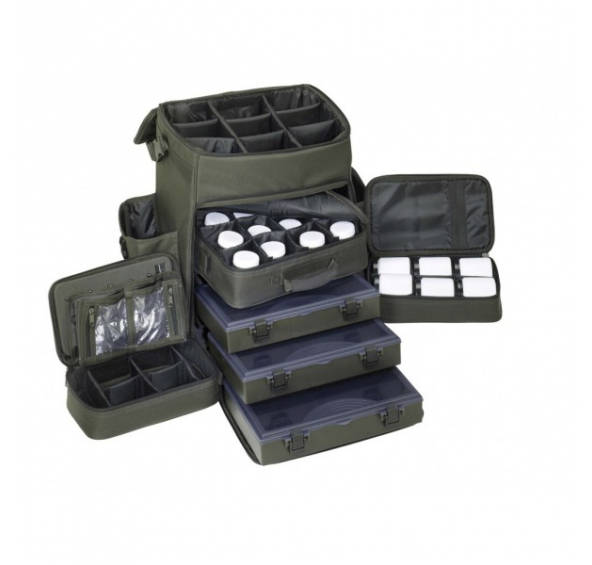 Touto taškou určenou výhradně pro rybáře jsme chtěli docílit toho, aby rybář měl vše potřebné na jednom místě. Je to multifunkční batoh se spoustou vestavěných kapes a různých boxů. Uvnitř batohu jsou tři velké krabice na drobný materiál a jedna taška na tekuté složky s dvanácti skleničkami. Při vytáhnutí těchto krabic lze použít tento výrobek, jako obyčejný batoh. V horní části se nachází další prostor s nastavitelnými přepážkami. Po stranách jsou dva odnímatelné boxy, kdy v jednom je 6 krabiček s kapacitou 250ml a v druhém 8 kapes na zip pro další materiál. Madla i ramenní popruhy jsou silně polstrované. Batoh má dále nastavitelný bederní pás. Materiál použitý při výrobě je voděodolný polyester 600D s PVC vrstvou a potahem odolávajícím vodě. Rozměry jsou56 x 35x48 cm.