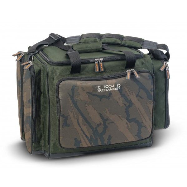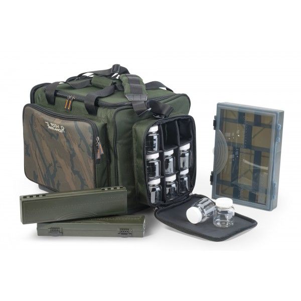 Praktická taška v maskovaném designu. Voděodolný polyester zaručuje bezpečné uložení vašeho vybavení. Elegantní vzhled doplňují robustní, kvalitní zipy a extra silně polstrovaný ramenní popruh, díky kterému lze tašku pohodlně přenášet. Součástí tašky jsou dva organizéry na návazce, velký organizační box a 9 dóz na nástrahy.