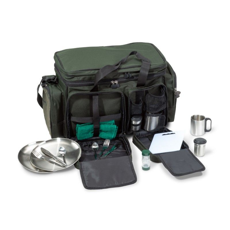 Celý popisTato taška plná nádobí vyrobeného z nerezové oceli vám zajistí luxusní stolování u vody. Ve dvou předních kapsách najdete 2x nerezovou vidličku, 2 x nerezový nůž, 2 x lžíci, 2 x nerezový talíř, ručník a prkénko. V hlavní přihrádce, která je extra silná, můžete uchovat jídlo a návnady v chladu po dlouhou dobu.
