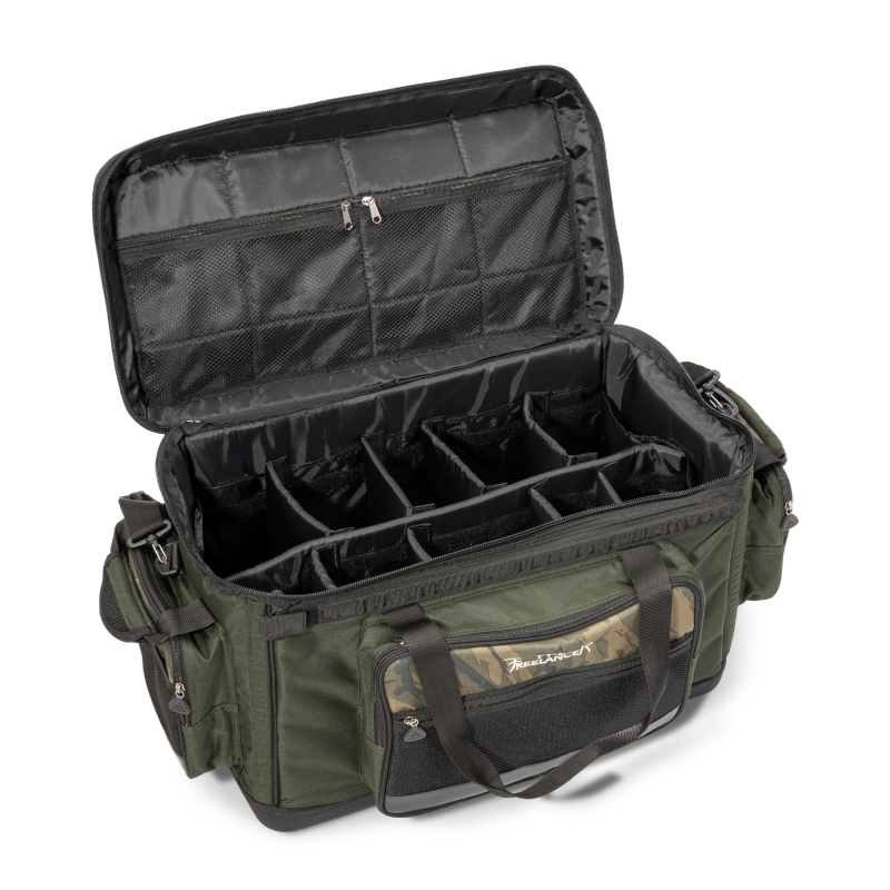 Nová taška pro kapraře v maskáčovém vzhledu Freelancer. Zesílené jsou nejen boční panely, ale také víko, které je vyrobeno z pevného materiálu, takže ho můžete použít jako stolek. Prostorná přední kapsa a další menší kapsy do kterých si můžete uložit spoustu rybářské bižuterie. Hlavní kapsu lze rozdělit pomocí přepážek, které se upevňují suchými zipy. Taška je vybavena krátkými držadly i ramenním popruhem. Vnější rozměry (Š x H x V): 78 × 37 × 36 cm Tvrdý víko, které lze použít jako stůl 8 přepážek upevněných suchým zipem Materiál: 600D polyester materiál: vodovzdorné PVC Moderní camo vzhled Freelancer ...