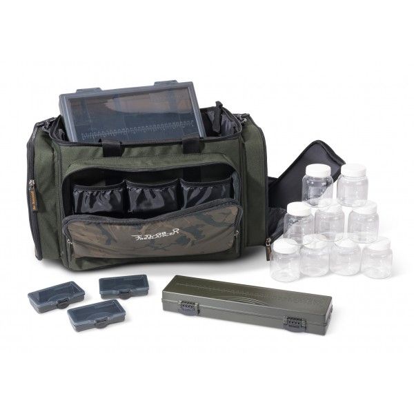 Multifunkční taška na rybářské potřeby. Dostatečný prostor, spousta kapes a 5 organizačních boxů umožňuje bezpečné přenášení rybářského vybavení. Stěny tašky mají vzpěry a drží stejný tvar, vrchní část je vyztužena a proto ji lze použít jako stoleček. Na vrchní části je elastickými pásky připevněn organizační box. Uvnitř tašky je organizér, v přední kapse jsou umístěny další organizační boxy. Součástí tašky je i 9 plastových dóz s gumovým těsněním na dipované nástrahy. Taška má praktická ucha a polstrovaný ramenní popruh.