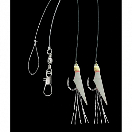 Mořský návazec se dvěma háčky velikost 14 potaženými pravou rybí kůží v přírodní barvě natural. Ideální pro lov menších mořských ryb, kdy ryby reagují na přirozený vzhled. Hlavní vlasec 0,35 mm, přívěs 0,30 mm, délka 150 cm, nosnost 6 kg....