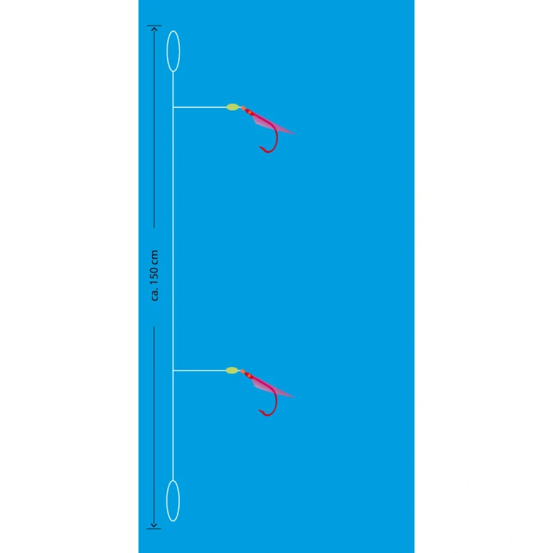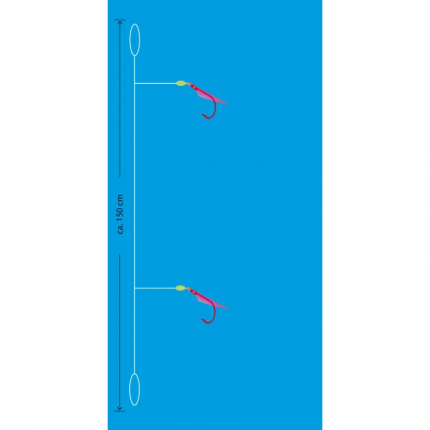 Mořský návazec se dvěma háčky velikost 4 potaženými pravou rybí kůží. Barva pink láká ryby i ve větších hloubkách a za šera. Hlavní vlasec 0,50 mm, přívěs 0,45 mm, délka 150 cm, nosnost 12 kg.