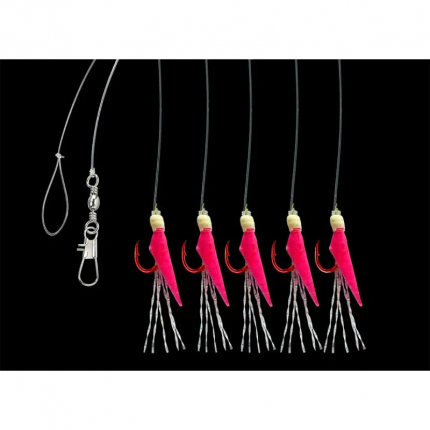 Mořský návazec s pěti háčky velikost 12 potaženými pravou rybí kůží v barvě pink. Ideální pro lov menších mořských ryb. Hlavní vlasec 0,35 mm, přívěsy 0,30 mm, délka 150 cm, nosnost 6 kg.