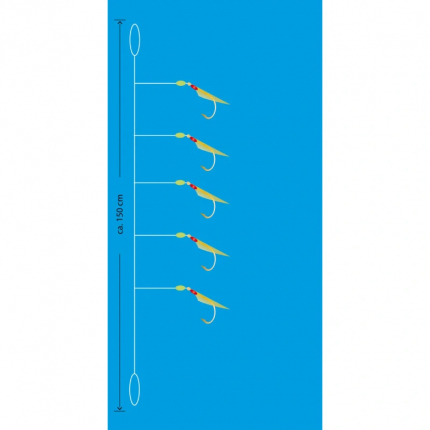 Kvalitní mořský návazec s pěti háčky velikost 4 potaženými pravou rybí kůží. Fluorescenční barva chartreuse zaručuje vysokou viditelnost i v hloubce. Hlavní vlasec 0,50 mm, přívěsy 0,45 mm, délka 150 cm, nosnost 12 kg.
