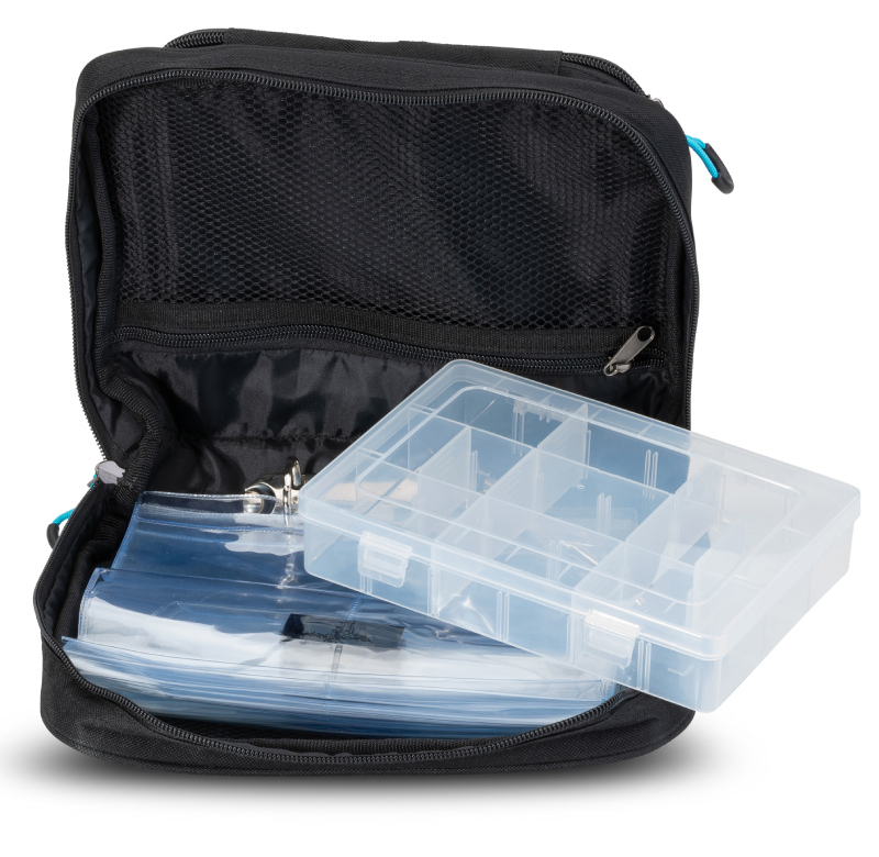 Organizér na nástrahy a drobný materiál potřebný k výrobě návazců, souprav a sestav při mořském rybolovu. • Polstrovaná rukojeť• 2 velké a 2 malé síťované kapsy se zipy• 10 průhledných kapes s celkem 20 přihrádkami a zapínáním• Materiál: 300 x 300 D• Rozměry: 27 x 12 x 21 cm...