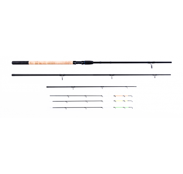 Velice povedený feedrový prut s akcí typu Medium. Prut je vyroben z vysoce kvalitních materiálů, má elegantní štíhlý blank, dělenou korkovou rukojeť zakončenou EVA a velice kvalitní SIC očka. Součástí prutu je sada 3 feedrových špiček v tubusu: 2oz(zelená) laminátová, 1,5 oz(žlutá) laminátová, 2,5 oz(oranžová) karbonová. Všechny feedrové špičky jsou o délce 510mm.