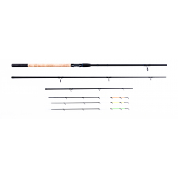 Velice povedený feedrový prut s akcí typu Medium. Prut je vyroben z vysoce kvalitních materiálů, má elegantní štíhlý blank, dělenou korkovou rukojeť zakončenou EVA a velice kvalitní SIC očka. Součástí prutu je sada 3 feedrových špiček v tubusu: 2oz(zelená) laminátová, 1,5 oz(žlutá) laminátová, 2,5 oz(oranžová) karbonová. Všechny feedrové špičky jsou o délce 510mm.