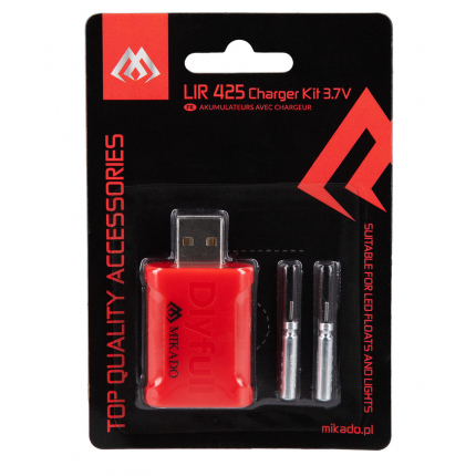 Sada, která obsahuje dvě baterie LIR425 a USB nabíječku. Baterie se hodí do LED splávků a koncových světel. Určeno pro všechny produkty Mikado ze sérií SMP-LED a IAIE.