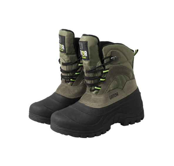 Zvýšený gumový lem podrážky sahá až do výšky kotníků, to znamená, že chůze v loužích, rozbředlém sněhu a blátě není pro GATOR problém. Tato pryžová část se navíc velmi dobře čistí. V zadní části gumové části boty se nachází výstupek, díky kterému si botu bez problémů zujete. Svršek boty je tvořen kombinací odolné nylonové látky a umělé kůže. Tyto materiály dobře odolávají nepřízni počasí a jednoduše se v případě potřeby impregnují. Jazyk boty je přišitý až do výšky 17 cm, to znamená, že krátkodobě se můžete pohybovat v takto hlubokých vlhkých oblastech. Šněrování je řešeno přes textilní očka, na vrchu šněrování se nachází jedno kovové oko. Vnitřek boty je tvořen příjemným mikrofleecovým materiálem. O tepelné pohodlí se postará vrstva umělého mikrovlákna mezi vnější a vnitřní vrstvou. Černo-zelenou kombinaci materiálů ocení nejen rybáři, ale i myslivci, turisté a všichni ostatní milovníci přírody. I přes svou mohutnost jsou boty velmi lehké, což jistě přijde vhod při dlouhodobější chůzi.