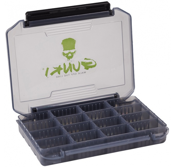 Krabička s oboustranným otevíráním pro uložení nástrah a drobností. Obsahuje celkem 16 přihrádek s 12 posuvnými oddělovači. Vnitřní uspořádání krabičky lze libovolně měnit. Rozměr 20,5x15,5x3,5 cm.