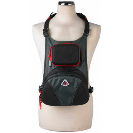Univerzální chestpack s dvěma předními kapsami pro populární typy krabiček. Jedna kapsa má pěnu pro připevnění návnad.