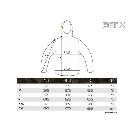 Zateplená bunda přinášející skvělý tepelný komfort během chladných, podzimních či zimních dní. Je vyrobena z tkaniny, která je příjemná na dotek a zároveň snadno udržovatelná, což je velmi praktické při použití během rybolovu a jiných outdoorových aktivitách. Bunda je zároveň příčně prošívaná, což vytváří stylový vizuální prvek produktu. Výplň bundy je extra lehká a zajišťuje výborné termoizolační vlastnosti. Zapínání je zajištěno pomocí kvalitního zipu, překrytého z vnější strany tkaninou, což zvyšuje jeho odolnost vůči vnějším podmínkám. Na obou stranách se nacházejí dostatečně velké kapsy na ruce nebo pro odložení potřebného příslušenství. Další kapsu naleznete na levé straně na hrudi a slouží k uschování mobilního telefonu, případně dokladů. Bunda Delphin BANX disponuje také kapucí, kterou lze zatáhnout pomocí stahovacího klipu. Rukávy jsou na koncích mírně zúžené a opatřené jemnou gumičkou, pro lepší obepnutí zápěstí. Design se skládá z černé barvy, kterou stylově doplňuje naše patentovaná kamufláž BANX. Díky této kombinaci ji můžete využít nejen při rybolovu, ale také k běžnému nošení. Podle přiložené velikostní tabulky si prosím zkontrolujte vyhovující velikost. Materiálové složení: 100% Polyester Pojem BANX vyjadřuje patentovanou kamufláž z dílny značky Delphin, která v sobě nese hluboký vzkaz. Jedinečné designové prvky, ze kterých je složená, jí dodávají nezaměnitelný charakter a dělají z ní více než jen vizuální vzor. Kamufláž BANX zobrazuje přesně to, co spojuje naši rybářskou vášeň napříč celou Evropou. Jsou to jezera, řeky či jiné vodní plochy. Od vod rumunského pobřeží, přes vodní nádrže na Slovensku až po ikonická jezera Evropy napříč Německem, Itálií až po úplný západ Evropy ve Španělsku. Právě siluety těchto jezer jsme spojili a vytvořili tak jedinečnou kamufláž s názvem BANX. Není to jen kamufláž - je to mapa. Mapa, která svým precizním designem zobrazuje ty nejznámější revíry Evropy, díky nimž bude vaše výbava vypadat maximálně jedinečně a originálně.
