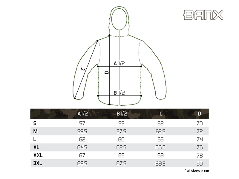 Zateplená bunda přinášející skvělý tepelný komfort během chladných, podzimních či zimních dní. Je vyrobena z tkaniny, která je příjemná na dotek a zároveň snadno udržovatelná, což je velmi praktické při použití během rybolovu a jiných outdoorových aktivitách. Bunda je zároveň příčně prošívaná, což vytváří stylový vizuální prvek produktu. Výplň bundy je extra lehká a zajišťuje výborné termoizolační vlastnosti. Zapínání je zajištěno pomocí kvalitního zipu, překrytého z vnější strany tkaninou, což zvyšuje jeho odolnost vůči vnějším podmínkám. Na obou stranách se nacházejí dostatečně velké kapsy na ruce nebo pro odložení potřebného příslušenství. Další kapsu naleznete na levé straně na hrudi a slouží k uschování mobilního telefonu, případně dokladů. Bunda Delphin BANX disponuje také kapucí, kterou lze zatáhnout pomocí stahovacího klipu. Rukávy jsou na koncích mírně zúžené a opatřené jemnou gumičkou, pro lepší obepnutí zápěstí. Design se skládá z černé barvy, kterou stylově doplňuje naše patentovaná kamufláž BANX. Díky této kombinaci ji můžete využít nejen při rybolovu, ale také k běžnému nošení. Podle přiložené velikostní tabulky si prosím zkontrolujte vyhovující velikost. Materiálové složení: 100% Polyester Pojem BANX vyjadřuje patentovanou kamufláž z dílny značky Delphin, která v sobě nese hluboký vzkaz. Jedinečné designové prvky, ze kterých je složená, jí dodávají nezaměnitelný charakter a dělají z ní více než jen vizuální vzor. Kamufláž BANX zobrazuje přesně to, co spojuje naši rybářskou vášeň napříč celou Evropou. Jsou to jezera, řeky či jiné vodní plochy. Od vod rumunského pobřeží, přes vodní nádrže na Slovensku až po ikonická jezera Evropy napříč Německem, Itálií až po úplný západ Evropy ve Španělsku. Právě siluety těchto jezer jsme spojili a vytvořili tak jedinečnou kamufláž s názvem BANX. Není to jen kamufláž - je to mapa. Mapa, která svým precizním designem zobrazuje ty nejznámější revíry Evropy, díky nimž bude vaše výbava vypadat maximálně jedinečně a originálně.
