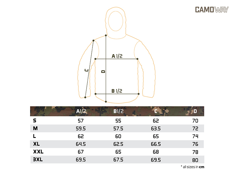 Bunda CamoWAY disponuje také kapucí, kterou lze zatáhnout pomocí stahovacího klipu. Rukávy jsou na koncích mírně zúžené a opatřené jemnou gumičkou, pro lepší obepnutí zápěstí.