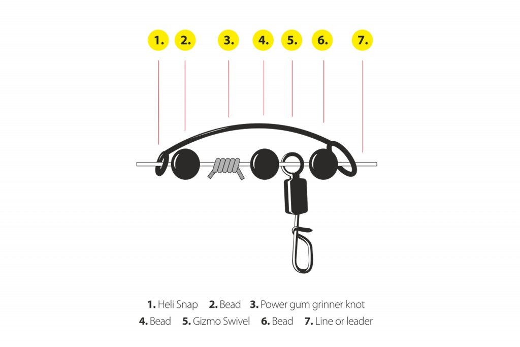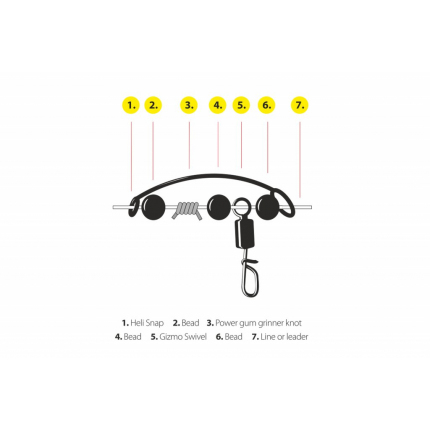 Sada pro výrobu montáží Running Helicopter rig. Ideální pro použití s monofilními vlasci, fluorocarbony, nebo leadery. Sada obsahuje power gumu k vázaní stoperovýh uzlů mezi dvěma malýma korálky, korálky, rychlo výměnný obratlík a svěrku. Přesný návod k sestavení celé montáže naleznete uvnitř balení. Sada je určená pro zhotovení 5 ks helicoptétových sestav....