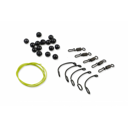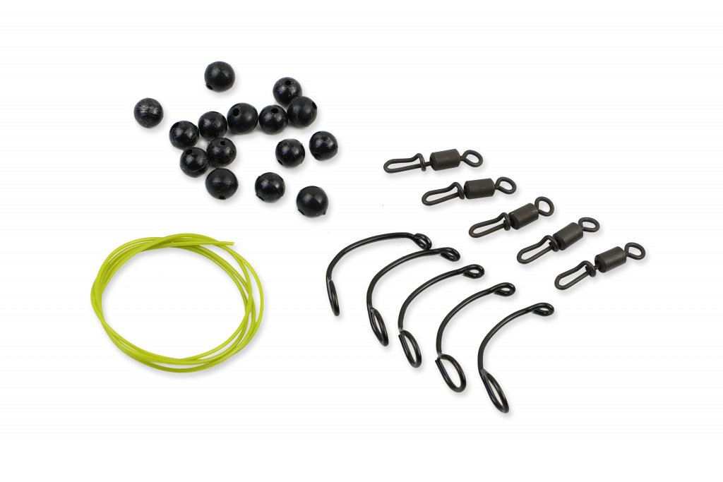 Sada obsahuje power gumu k vázaní stoperovýh uzlů mezi dvěma malýma korálky, korálky, rychlo výměnný obratlík a svěrku. Přesný návod k sestavení celé montáže naleznete uvnitř balení.