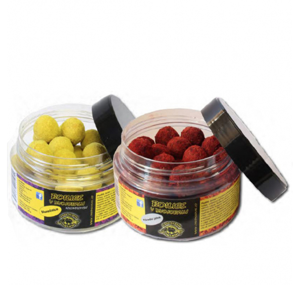 Boilies v dvojobalu je speciálně zatraktivněné boilies určené pro aplikaci přímo na háček pomocí tzv. vlasové metody. Boilies je ošetřeno ve dvou krocích různými druhy atraktorů, které se po vhození do vody rozdílně chovají. Nejprve se aktivním způsobem uvolní vnější vrstva obalu, která je mnohem rozpustnější než vrstva pod ní. Druhá vrstva se začne uvolňovat až později a rychlost rozpouštění je mnohem pozvolnější, než je tomu u vnější vrstvy. Celkově se tyto druhy atraktorů doplňují a tvoří společně vynikající prostředek k přilákání kaprů.Boilies dwupak jest specjalnym produktem przynęt przeznaczonym do stosowania bezpośrednio na haczyku za pomocą tzw. metody włosowej. Przynęta poddawana jest dwukrotnej obróbce, co powoduje, że pokryta jest dwoma óżnymi rodzajami aromatów, które po wrzuceniu do wody różnie się zachowują. Po pierwsze, w sposób aktywny uwalnia się warstwa zewnętrzną przynęty. Druga warstwa zaczyna się rozpuszczać później , a szybkość tego procesu jest znacznie mniejsza niż w przypadku warstwy zewnętrznej. Reasumując, taki sposób użycia wzajemnie zpełniających się aromatów pozwala na szybkie i długotrwałe przyciągnięcie karpi w nasze łowisko.Boilies in two attractors are especially designed for application directly to the hook by so-called hair method. Boilies is treated in two steps, the various kinds of attractors that behave in water differentl. First, the active way releases the outer layer of the boilie which is more soluble than the layer beneath it. The second layer starts to be released later, and the dissolution rate is much slower than that of the outer layer. Overall, these types of attractors are complementary and together form an excellent means of attracting carp.