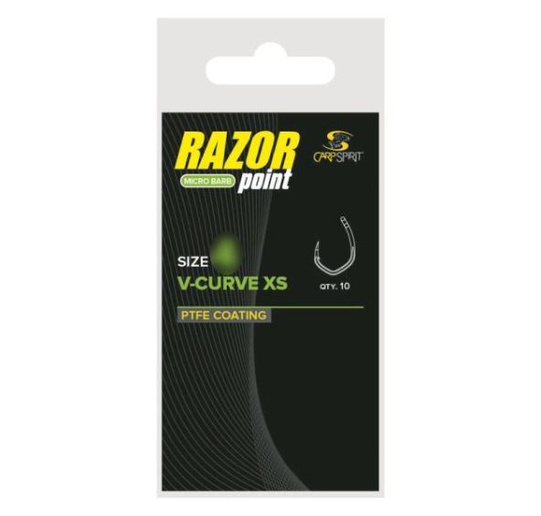 To nejlepší z řady háčků Razor Point, přidaný patentovaný tvar písmene V, a na světě je háček, který se již osvědčil v celé Evropě. Dvouletý vývoj a testování prokázalo perfektní schopnost háčku přenášet tažnou sílu ryby ze špičky na střední část ramínka a tím eliminovat cestování hrotu v tlamce a možnou ztrátu úlovku. Mimořádně otevřený oblouk, krátké ramínko a dovnitř zahnutý hrot výrazně přispívají k průniku ostří, bez ohledu na to o jaký typ montáže právě jde. V-Curve XS je ukován ze silnějšího drátu a tak se dokonale hodí k lovu poblíž vázek a k silovému zdolávání ryb. Jako u celé řady Razor Point nechybí ani zde kvalitní ocel, teflonový povrch PTFE šedé barvy a drobný protihrot, bránící vysmeknutí háčku.