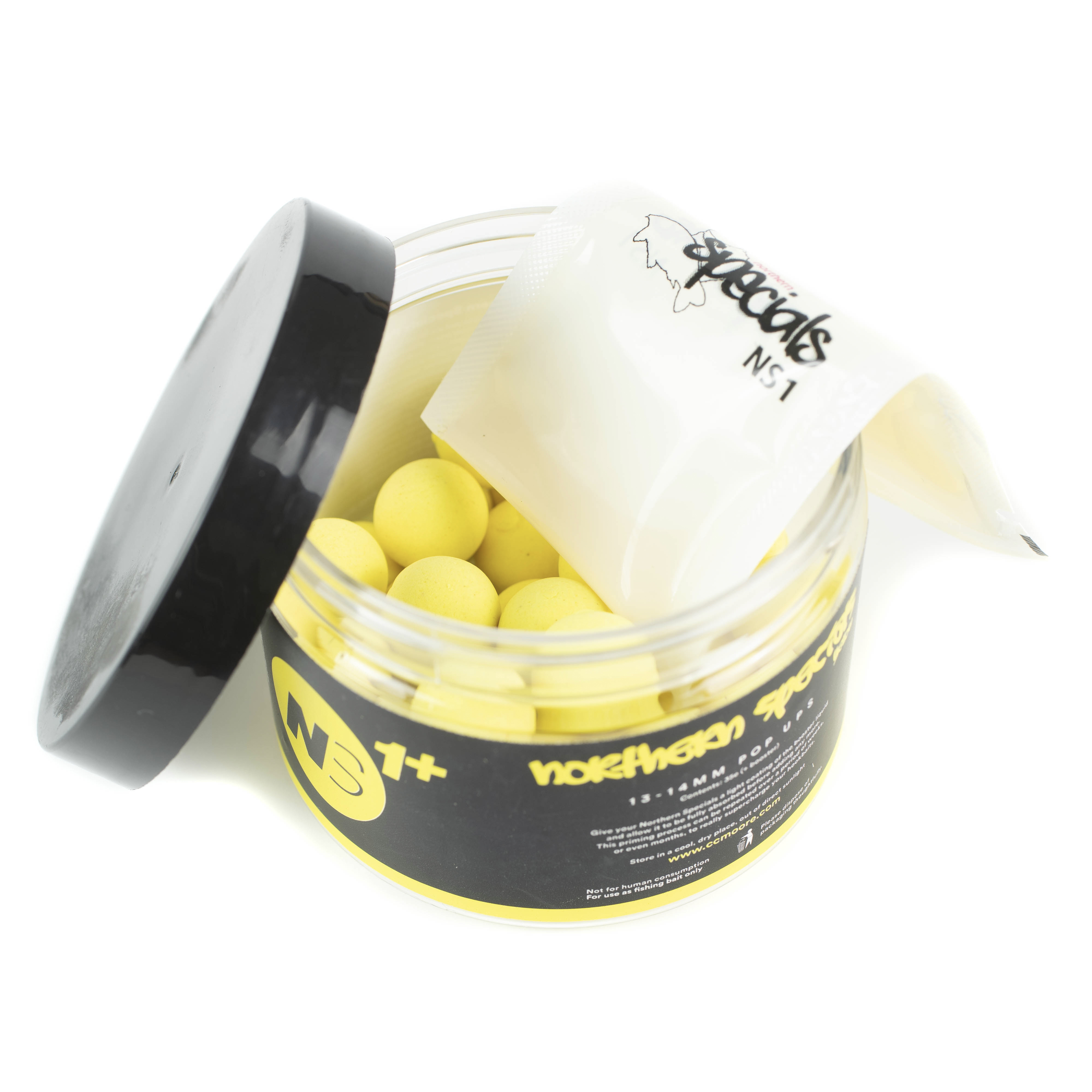 NS1+ v průměru 14 mm (35 ks), v barvách bílá, žlutá, růžová a oranžová jsou vylepšenou a především více plovoucí variantou klasických NS1. proto se velmi dobře hodí i pro lov ve sloupci způsobem Zig-rig nebo Chod-rig. Plovoucí boilie NS1 (Northern Specials) jsou vyráběny dle receptury anglického profi kapraře Gaze Farehama, který ji spolu se svými kamarády roky vypiplával k dokonalosti. Specifický citrusový nádech dává tušit silnou atraktivitu a použitelnost po celý rok včetně velmi studené vody. V kelímku je přiložený tekutý aktivátor, který můžete použít ve chvíli, kdyby při delším skladování začala vůně pomalu ochabovat.