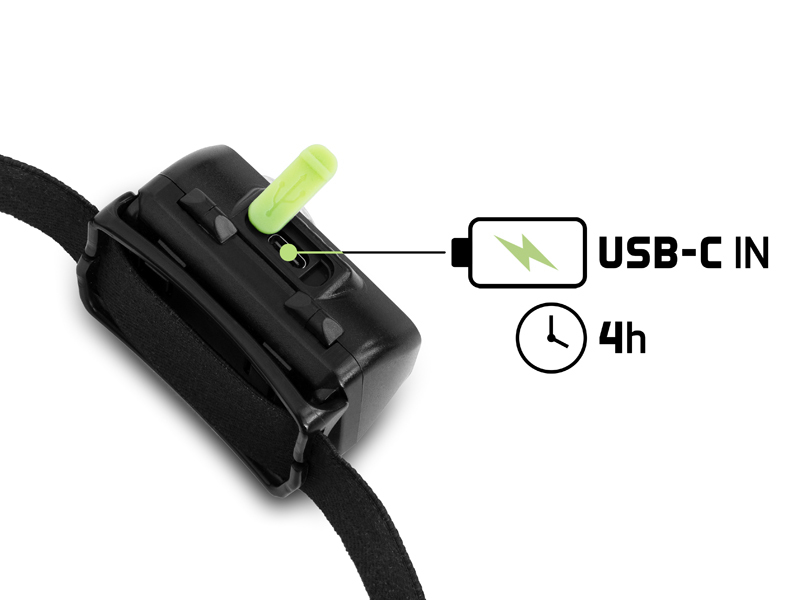 Čelovka má v sobě zabudovanou 1200 mAh baterii, která se nabíjí prostřednictvím USB-C kabelu. Plné nabití trvá přibližně 4 hodiny. Na těle čelovky se nachází indikátor baterie, který zobrazuje aktuální stav nabití.