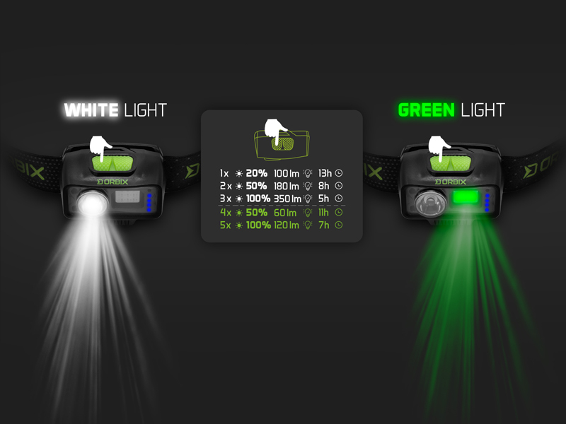 Celý popisNa čelovce se nacházejí dvě LED diody, které nabízejí možnost bílého nebo zeleného světla. Při prvním stisku spínacího tlačítka se rozsvítí bílé světlo o intenzitě 20 % (100lm), přičemž baterie vydrží 13h. Opakovaným stisknutím se aktivuje režim 50 % s výdrží 8 hodin, a třetím stisknutím se rozsvítí bílé světlo na 100 %, přičemž baterie vydrží 5 hodin.