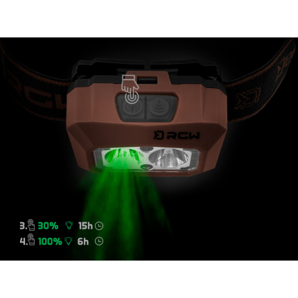 RWG PRO UC disponuje pohybovým senzorem a třemi barvami svícení, mezi které patří klasické bílé světlo, ale také zelené a červené. Po prvním kliknutí se čelovka rozsvítí na 30% a vydrží svítit až 10 hodin. Po druhém kliknutí svítí na 100% s výdrží 4h. Při třetím kliknutí se změní barva svícení na zelenou s intenzitou 30% a excelentní výdrží až 15h. Po 4. kliknutí svítí zelené světlo na 100% a při 5. kliknutí se na 100% rozsvítí světlo červené. Právě zelené a červené světlo nepřitahuje otravný hmyz a rozhodně ho oceníte i během zdolávání ryb, které se plaší mnohem méně než při osvícení bílým světlem. Senzor pohybu lze aktivovat pomocí druhého tlačítka a na rozsvícení lampy tak stačí před ní zamávat dlaní. Nespornou devizou je také indikace kapacity baterie, která se na čelovce rozsvítí při delším podržení spínacího tlačítka. Baterii s kapacitou 1500 mAh je možné nabíjet přes USB-C kabel, přičemž plné nabití trvá 4,5h. Samotná lampa je upevněna na pevném elastickém popruhu s efektním logem Delphin a názvem RGW PRO. Lampu lze podle potřeby polohovat směrem nahoru a dolů. Ať už jste rybář, myslivec nebo outdoorový nadšenec, Delphin RGW PRO UC nepochybně uspokojí vaše nároky na kvalitní čelovku s množstvím moderních funkcí.