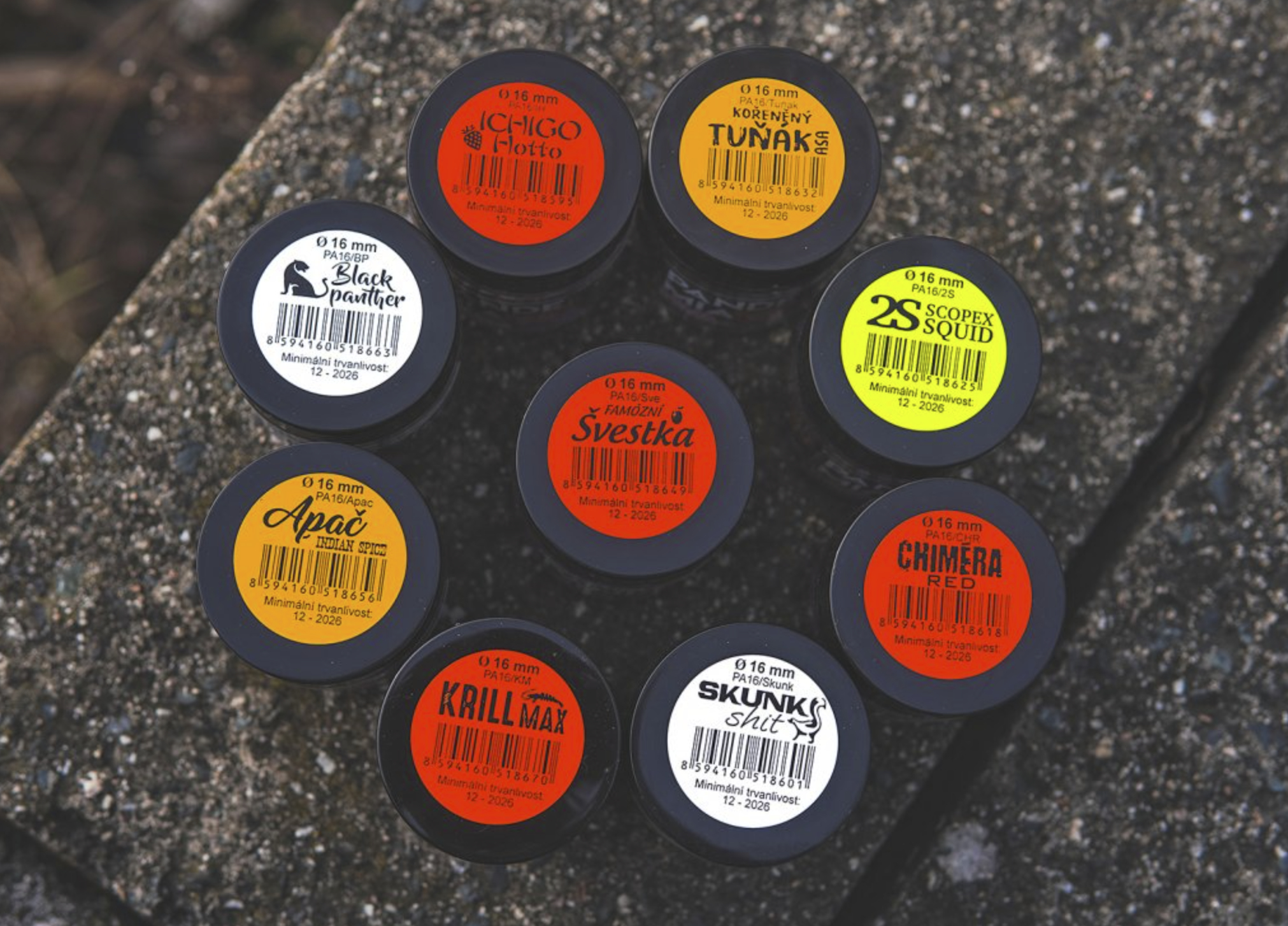 - Black Panther – Broskev/Pepř Oblíbená kombinace chytlavých vůní v černém kabátu. Kombinace příjemné anglické esence Broskev a esenciálního oleje černý pepř je známou, dá se říci na rybářském trhu provařenou kombinací. Boilies se skvěle osvědčilo při lovu velkých kaprů na rozlehlých štěrkovnách s tvrdým dnem. Roční období: J, L, P Tip vody: Š