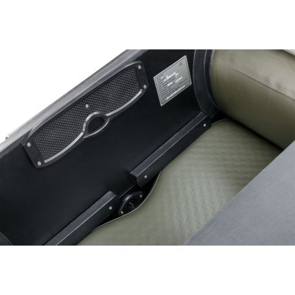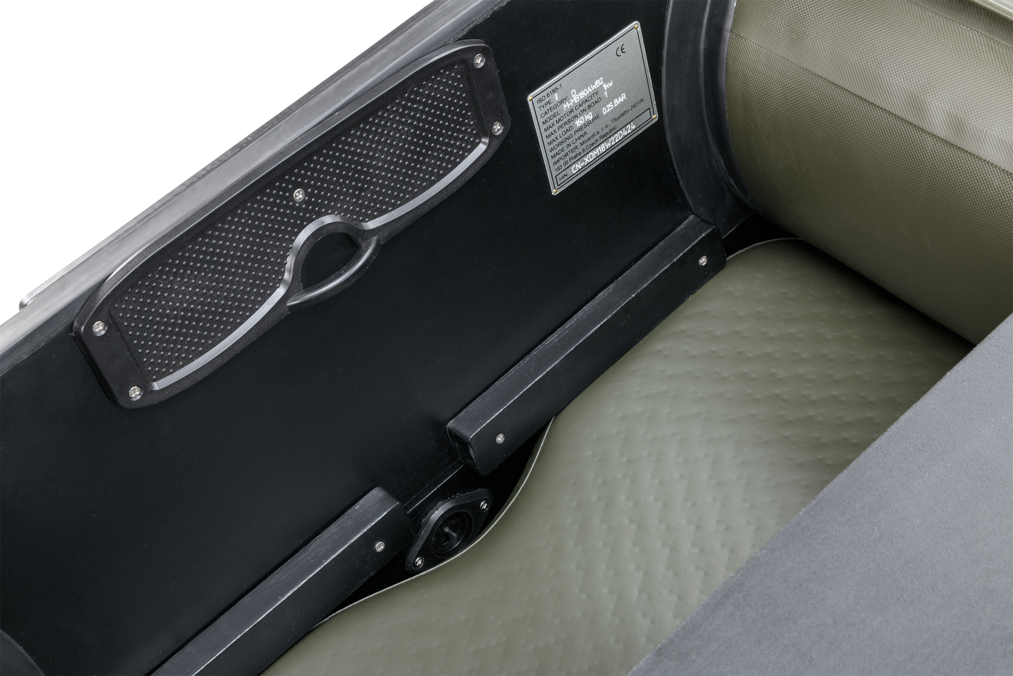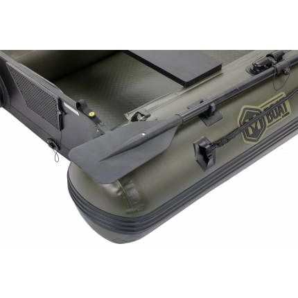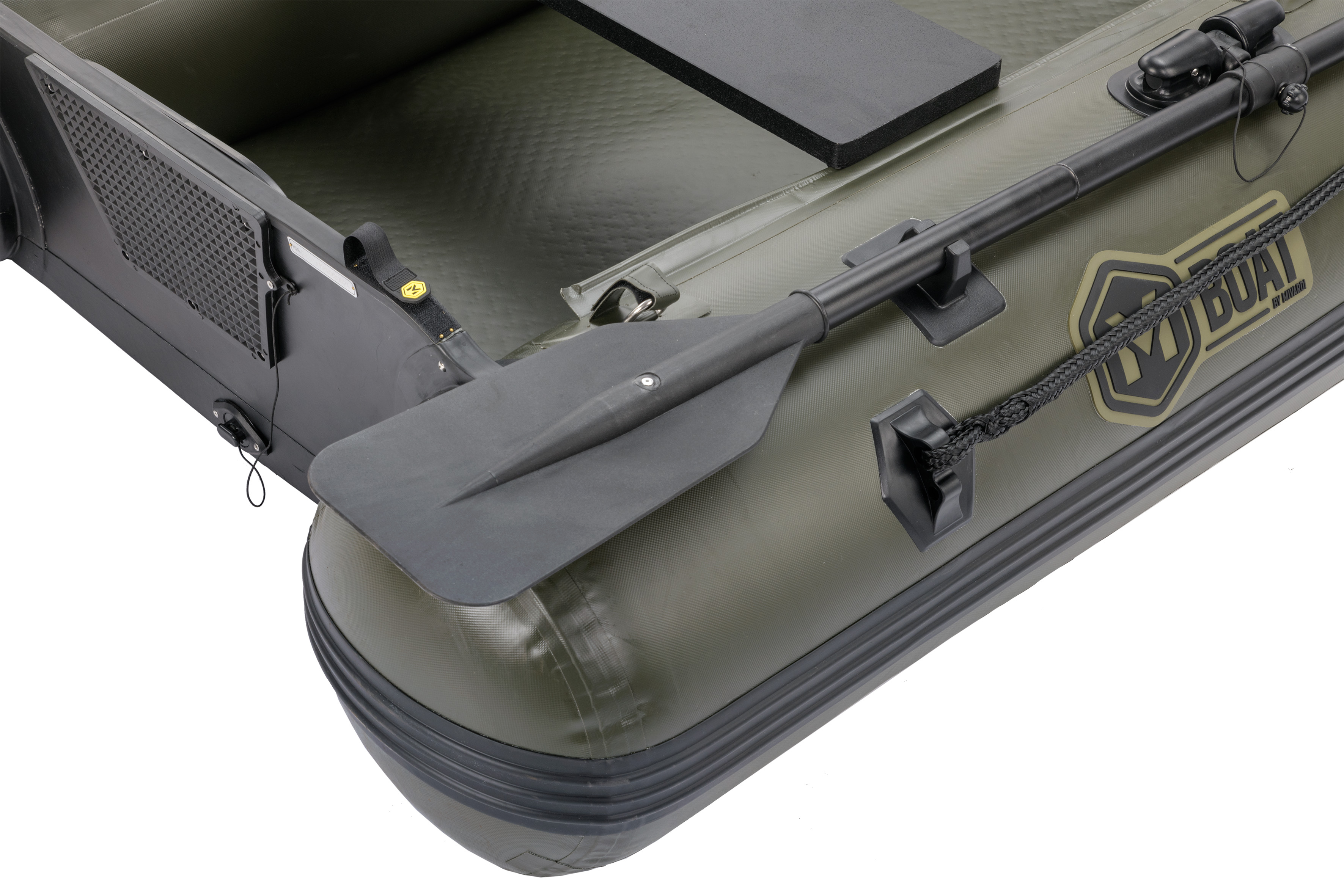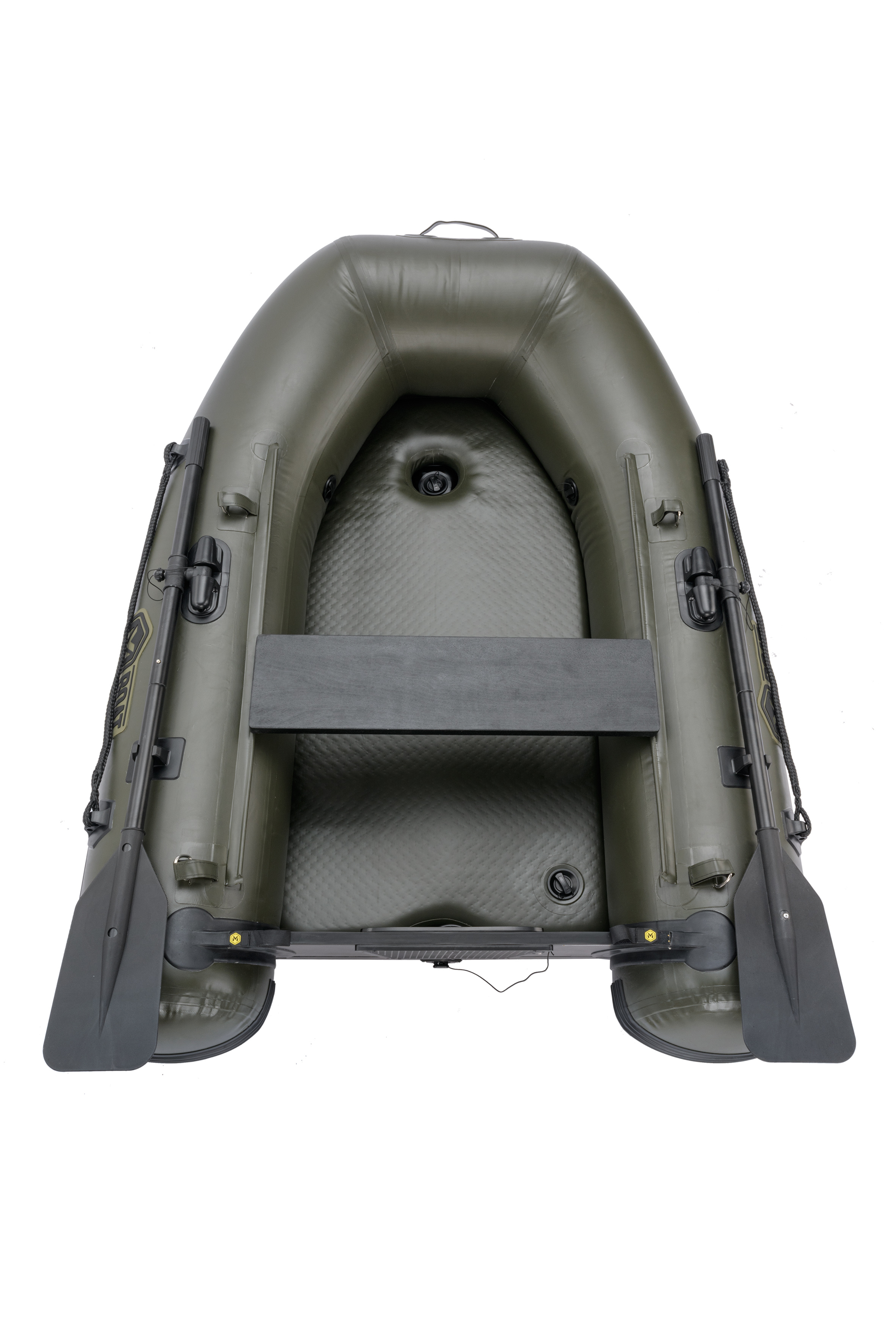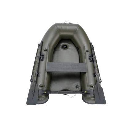 Celý popisNadstandardní šířka a specifický tvar člunu zajišťují extrémně velký vnitřní prostor. Ten je vždy výrazně větší než u běžných člunů stejné délky na trhu. Tomu napomáhá i specifické řešení zadní části plováků, které dovoluje umístit zrcadlo co nejblíže ke konci plováků a zároveň zachovat jejich funkci při udržování směru jízdy. Výrazně zdvihnutá příď spolu se speciálním tvarováním přední části, mohutným nafukovacím kýlem v celé délce podlahy a speciálně tvarovaným zrcadlem zajišťují vynikající hydrodynamické vlastnosti člunu a směrovou stabilitu. To v praxi znamená vyšší rychlost , snadnější ovládání a nižší spotřebu energie při pohonu člunu. Zesílený materiál plováků zvyšuje odolnost proti proražení. Nafukovací podlaha se zdvojenou nášlapnou vrstvou je téměř nezničitelná a její zelená barva skvěle ladí s se zbarvením člunu i černými vesly a ostatními doplňky. Každý člun je vybaven řadou upínacích pásků na suchý zip v přední části i na zrcadle. Najdeme zde i masivní upínací popruh na příslušenství ve střední části.