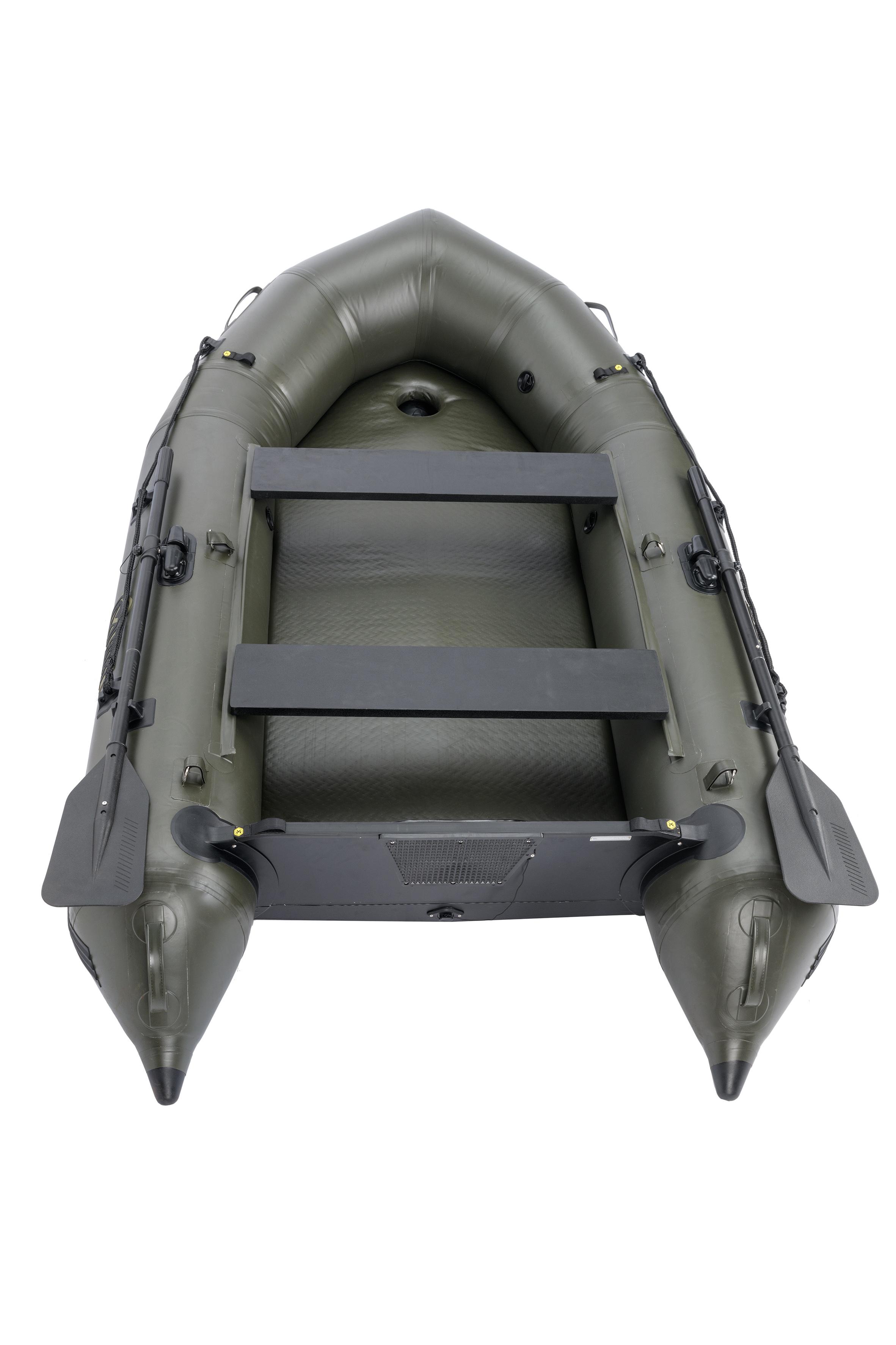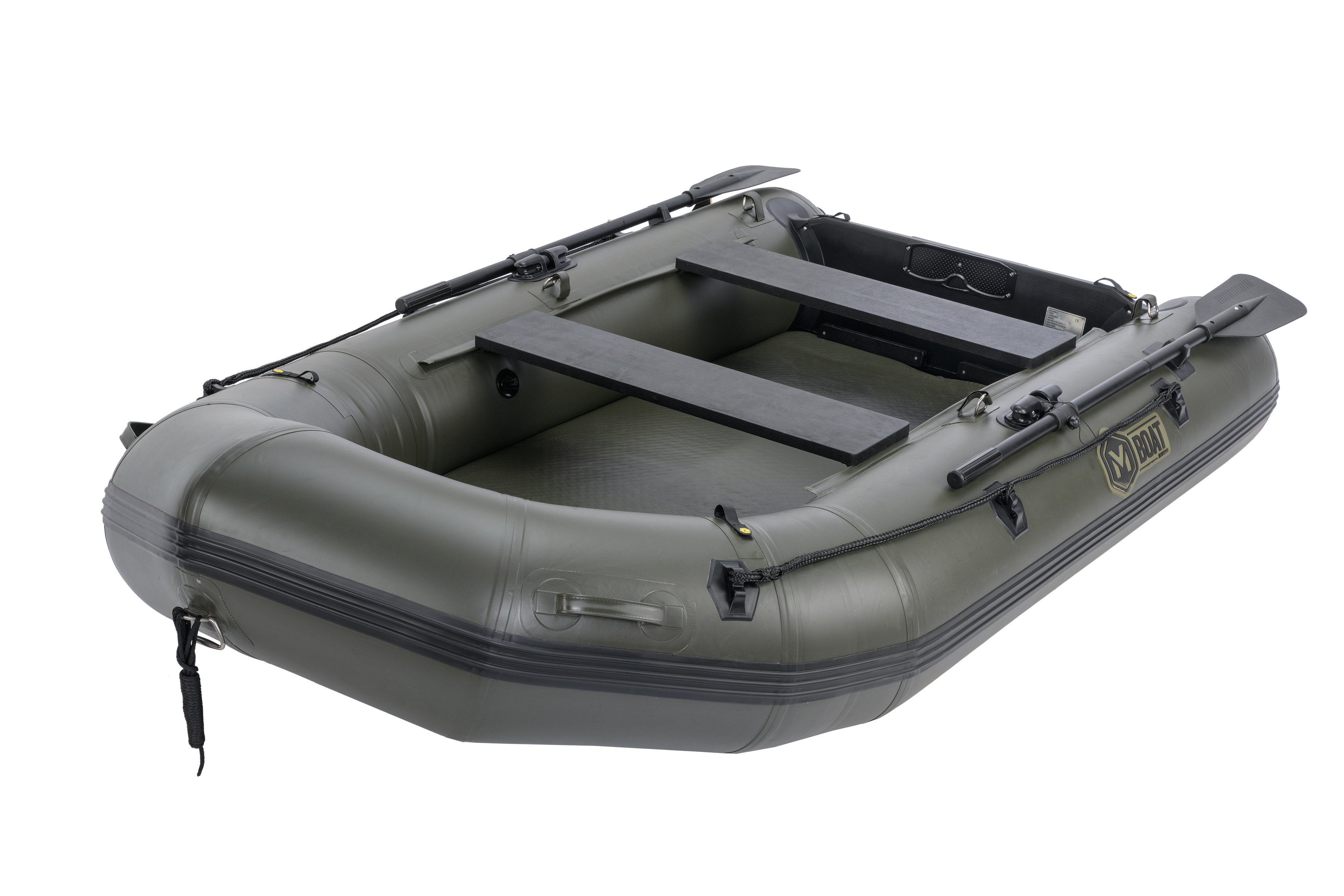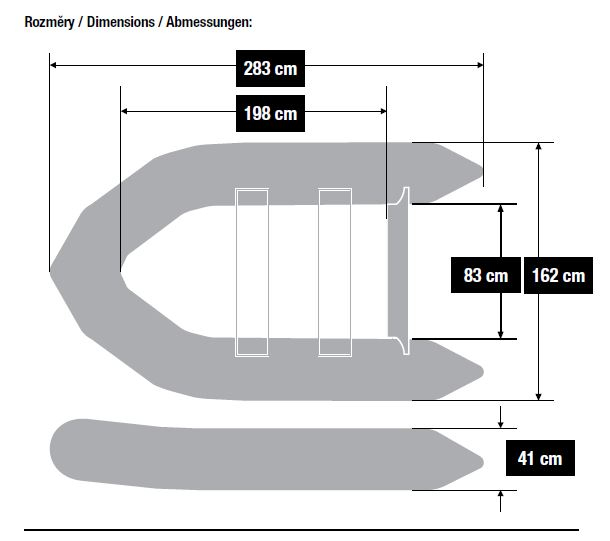 Celý popisNadstandardní šířka a specifický tvar člunu zajišťují extrémně velký vnitřní prostor. Ten je vždy výrazně větší než u běžných člunů stejné délky na trhu. Tomu napomáhá i specifické řešení zadní části plováků, které dovoluje umístit zrcadlo co nejblíže ke konci plováků a zároveň zachovat jejich funkci při udržování směru jízdy. Výrazně zdvihnutá příď spolu se speciálním tvarováním přední části, mohutným nafukovacím kýlem v celé délce podlahy a speciálně tvarovaným zrcadlem zajišťují vynikající hydrodynamické vlastnosti člunu a směrovou stabilitu. To v praxi znamená vyšší rychlost , snadnější ovládání a nižší spotřebu energie při pohonu člunu. Zesílený materiál plováků zvyšuje odolnost proti proražení. Nafukovací podlaha se zdvojenou nášlapnou vrstvou je téměř nezničitelná a její zelená barva skvěle ladí s se zbarvením člunu i černými vesly a ostatními doplňky. Každý člun je vybaven řadou upínacích pásků na suchý zip v přední části i na zrcadle. Najdeme zde i masivní upínací popruh na příslušenství ve střední části.