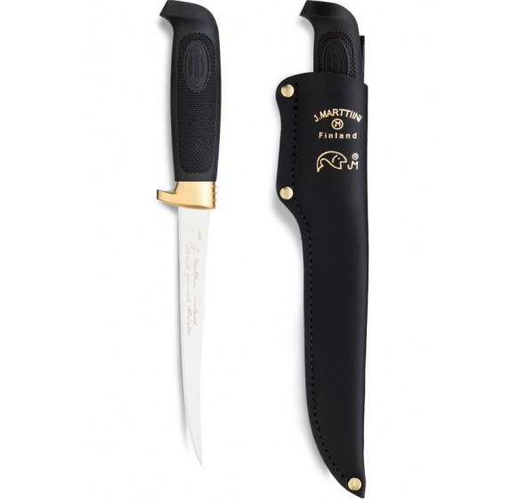 Moderní filetovací nůž se strukturovanou gumovou rukojetí a zarážkou na prst. Délka čepele se nejlépe hodí na filetování ryb do 1 kg. Nůž má černou koženou pochvu.