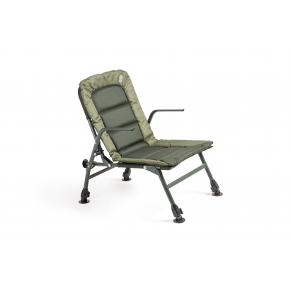 Všechny čtyři nohy jsou vybaveny patkami proti zaboření a jejich délku lze individuálně nastavit pro zajištění stability i na nerovném povrchu. Extra dlouhé opěradlo může být nastaveno přesně na vaši postavu. Vpředu se nacházejí dva kulaté adaptéry, které pasují na všechny běžné feederové hrazdy a doplňky o průměru 36 mm. Obě přední části lze výškově nastavit podle vašich individuálních potřeb.