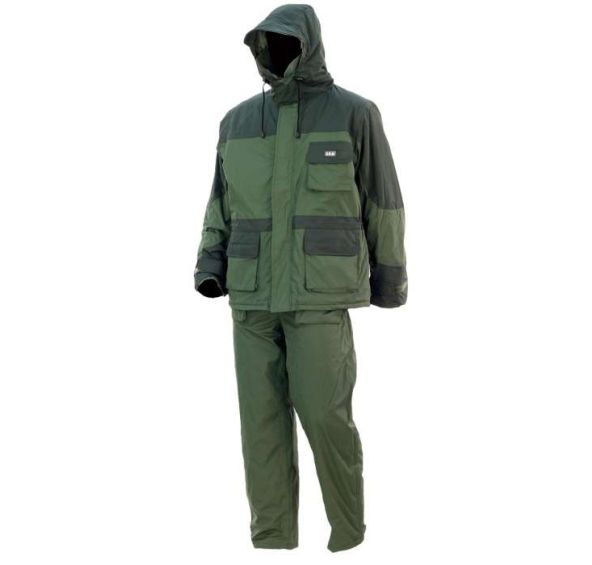 Dvojdílný termooblek v zelenošedém provedení sestávající z dlouhé bundy a kalhot s laclem. Povrch je opatřen příjemným nešustivým materiálem se Soft-Touch povrchem. Nosný materiál zevnitř potažený PVC vrstvou a doplňkově podlepené švy dělají oblek odolným proti větru a nepřízni počasí.