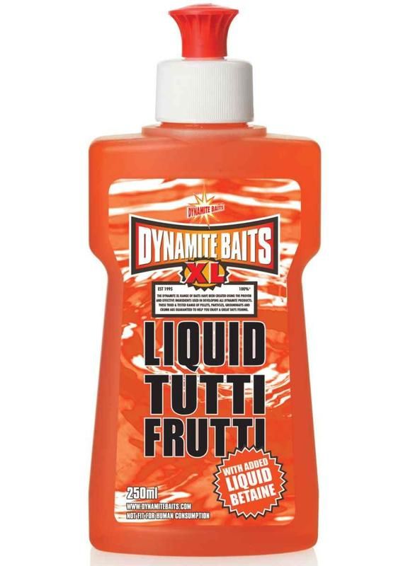 Dynamite Baits Liquid XL Tutti Frutti 250ml - silné, tekuté aroma s příchutí tutti frutti • Obohaceno betainem • Slouží k obohacení boilií,sypkých směsí, pelet a háčkových návnad