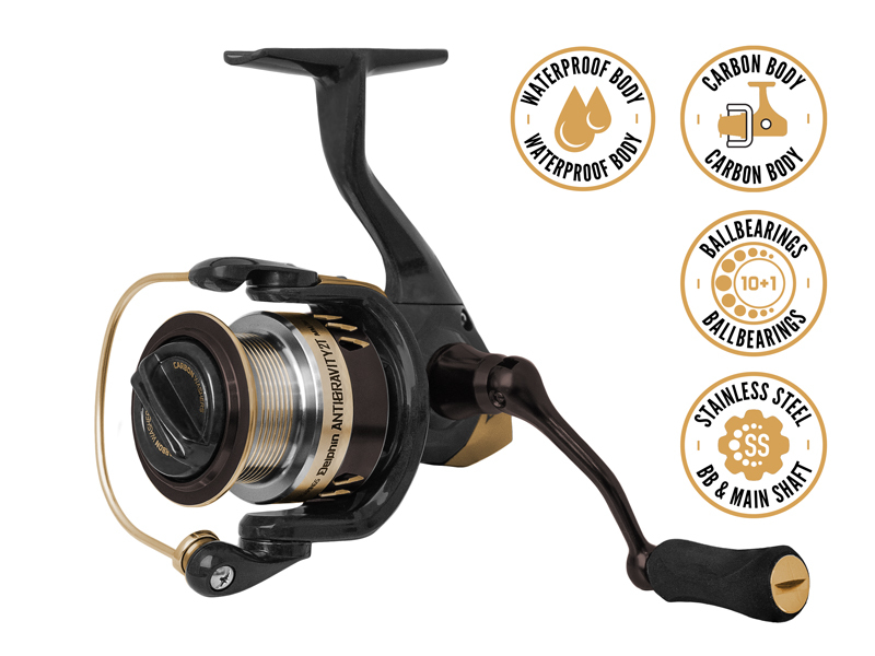 Zlaté doplňky podtrhují luxusní design navijáku s hmotností "peříčka", díky kterému zapomenete, že v rukou držíte rybářské nářadí.