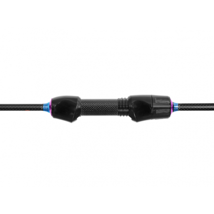 Sedlo prutu je velmi lehké a díky ergonomickému tvaru se skvěle drží v ruce. Po celé délce jsme použili jednostopková očka s modrým metalickým vinutím, která jsou rozmístěna tak, aby zaručovala rovnoměrné rozmístění síly a optimální vyvážení prutu. Povrchová úprava je matná, doplněná lesklým povrchem na rukojeti s efektním 3K karbonovým motivem.