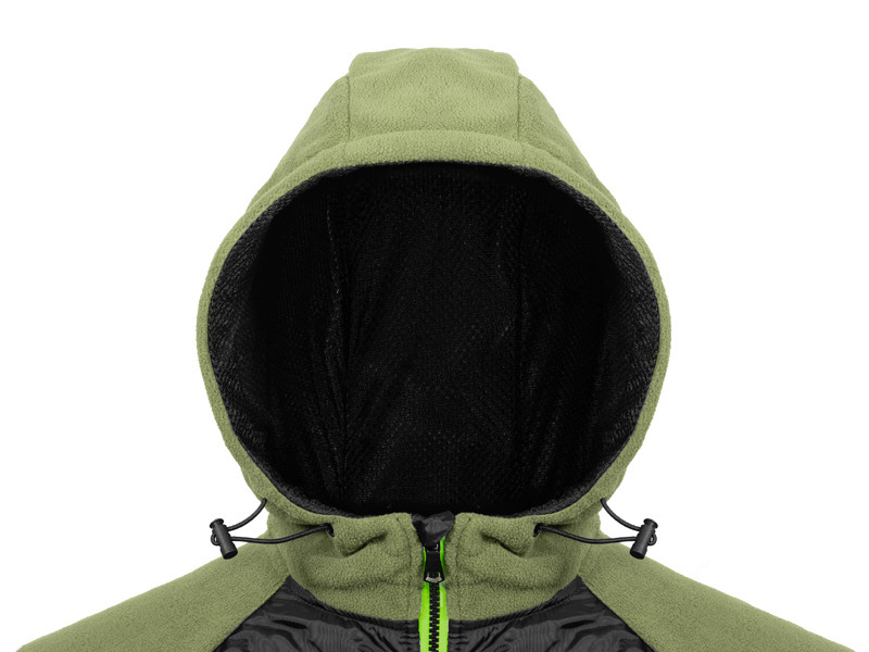Střed bundy tvoří lehký, prošívaný panel, který účinně chrání před větrem a chladem, zatímco rukávy, boky a kapuce jsou pro maximální pohodlí a volnost pohybu vyrobeny z na dotek příjemného měkkého flísu, který zahřeje i během sychravých dnů. Nastavitelná kapuce je zevnitř doplněna prodyšnou síťkou, která zvyšuje komfort při aktivním nošení a zajišťuje lepší ventilaci.