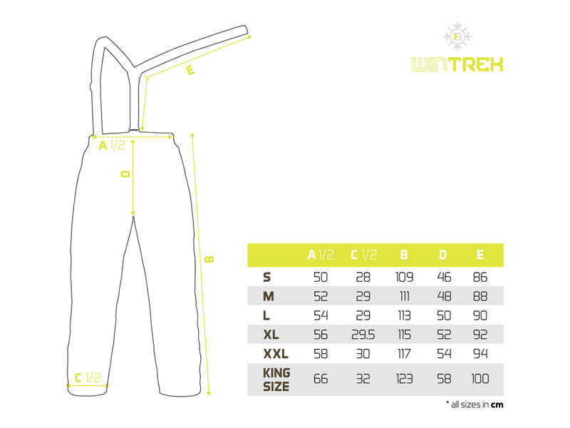 Kalhoty WinTREK disponují kapsami na zip po obou bocích, přičemž zipy jsou prošity výraznou žlutou textilií a překryty lemem z voděodolné tkaniny. Na pase se nacházejí gumové kšandy nastavitelné dle vaší výšky a kompletně odepínatelné na suché zipy. Samotný pás disponuje všitou gumičkou zvyšující jeho flexibilitu a pružnost. Vnitřní strana je tvořena hladkou prošívanou látkou, díky které se kalhoty snadno oblékají a dobře nosí.